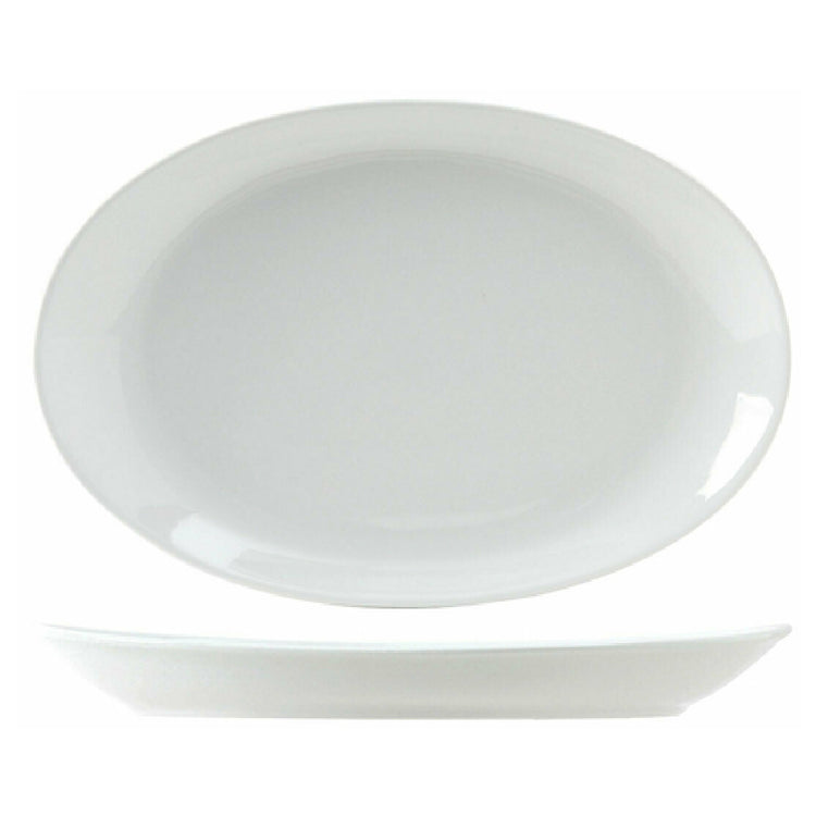 The Tuxton ALH-136W Wing Platter is a meticulously crafted dishware piece, measuring 13-3/4 inches in length and 9-1/4 inches in width, designed to enhance dining experiences across various sectors. It is microwave and dishwasher safe, ensuring convenience and efficiency in fast-paced environments. Its oven-proof capability makes it versatile for diverse culinary applications. The platter is fully vitrified, contributing to its durable and non-porous nature, which enhances its resilience and longevity in high-demand settings. Being lead-free, it prioritizes user safety, aligning with health and environmental standards. The TuxCare® Healthcare designation emphasizes its suitability for healthcare settings, where reliability and safety are paramount. Its Porcelain White finish offers a clean and sophisticated aesthetic, complementing a wide array of table settings. This product is available in a packed quantity of one dozen, making it an economical choice for businesses needing bulk purchasing. The Tuxton ALH-136W Wing Platter is an exemplary choice for industry sectors including healthcare, hospitality, and food service, where durability, safety, and practicality are essential. Whether for hospitals, restaurants, or catering services, this platter delivers quality and performance tailored to professional culinary environments.