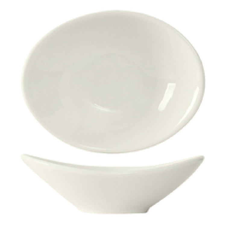 The Tuxton AMU-411 Capistrano Bowl is an expertly crafted piece of ceramic tableware, designed to meet the diverse needs of the food service industry. This petite bowl boasts a capacity of 1-1/2oz and measures 3-1/2" in length, 2-3/4" in width, and 1-1/8" in height, making it an ideal choice for serving individual portions or condiments. Its oval shape adds a touch of elegance to any tabletop presentation. The bowl is microwave and dishwasher safe, ensuring convenience in both food preparation and cleanup. It is oven proof, allowing for versatile use in different cooking environments. Fully vitrified and lead-free, the Tuxton AMU-411 prioritizes safety and durability, making it suitable for continuous use in high-demand settings. The bowl is crafted from AlumaTux® ceramic, known for its strength and resilience. Presented in a classic Pearl White finish, this specialty item enhances any dining experience with its refined appearance. The Tuxton AMU-411 Capistrano Bowl is packaged by 2 dozen per case, catering to establishments that require high-quality, reliable tableware in bulk. This product's technical specifications and design make it a valuable addition to restaurants, catering services, and hospitality venues seeking durable and aesthetically pleasing serveware.