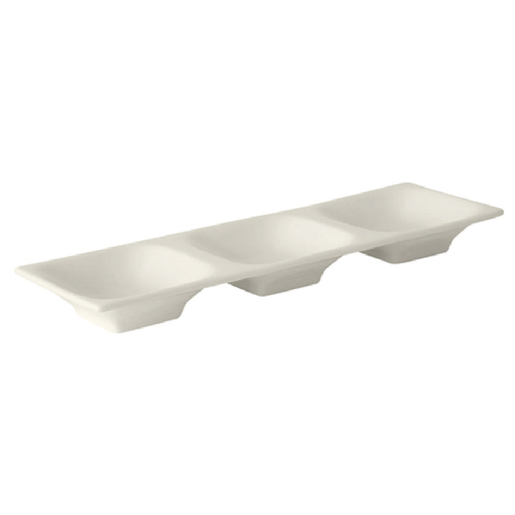 The Tuxton AMU-555 Plate - 13" L x 4-1/4" W x 1-1/4" H Rectangular is a meticulously crafted piece of ceramic ware designed to meet the diverse needs of the food service industry. This rectangular plate features three distinct compartments, making it an ideal solution for serving multiple dishes or courses simultaneously without mixing flavors. Its fully vitrified ceramic construction ensures durability and resistance to chipping, while also being lead-free, prioritizing safety and health. The plate's AlumaTux® technology enhances its strength and provides a classic Pearl White finish that complements any table setting. It is microwave and dishwasher safe, offering convenience for both preparation and cleaning processes, and is oven proof, allowing for versatile use from cooking to presentation. Packed by the dozen, this plate is perfect for establishments requiring consistency and reliability in high-volume settings. The Tuxton AMU-555 Plate stands out for its blend of functionality and elegance, making it a valuable asset for restaurants, hotels, and catering services looking for quality and efficiency in their dinnerware selections.