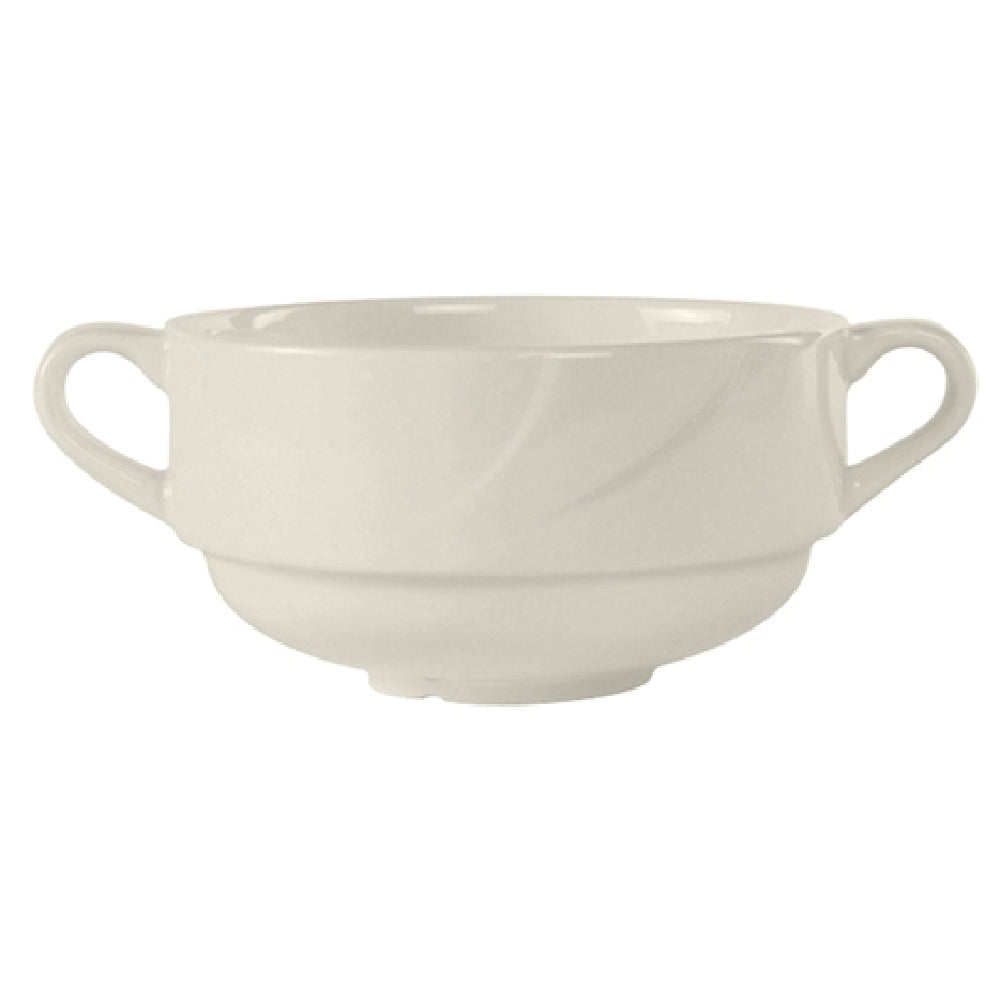 The Tuxton ASU-044 Soup Cup is a meticulously crafted ceramic cup with a capacity of 10-1/2 oz., making it suitable for a variety of dining settings. With dimensions of 4-1/8" in diameter and 2-3/8" in height, this round soup cup features a double-handled design, offering both practicality and elegance. The embossed pattern adds a subtle touch of sophistication, enhancing its aesthetic appeal. Notably, the cup is stackable, providing an efficient storage solution for busy kitchens. It is designed to be microwave and dishwasher safe, ensuring convenience in meal preparation and cleanup. Additionally, the cup is oven-proof and fully vitrified, offering exceptional durability and resistance to thermal shock. Crafted from lead-free ceramic, it adheres to high safety standards. The AlumaTux® San Marino Pearl White finish ensures a timeless and versatile look, complementing various table settings. Packed by 2 dozen per case, the Tuxton ASU-044 Soup Cup is an ideal choice for restaurants, catering services, and hospitality venues seeking a functional yet stylish option for serving soups and other culinary creations.