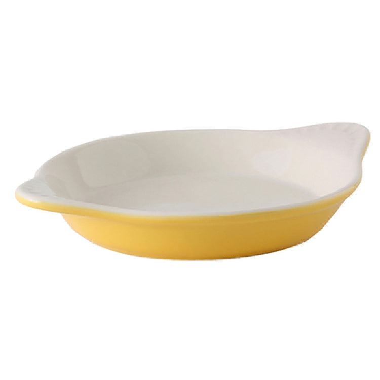 The Tuxton B8N-0902 Shirred Egg is an expertly crafted ceramic dish designed for versatile use in both professional and home kitchens. With a capacity of 9 ounces, its dimensions of 7-3/4" x 6-1/8" x 1" H make it an ideal choice for preparing and serving shirred eggs and other delicate dishes. This round dish is a part of the DuraTux® collection, known for its superior strength and durability. It is fully vitrified, ensuring a non-porous surface that is resistant to moisture absorption, and it is lead-free, supporting safe food consumption. The Tuxton B8N-0902 is both microwave and dishwasher safe, offering convenience for busy food service environments, and it can withstand oven temperatures, making it versatile for various cooking techniques. Its Saffron/Eggshell color adds a touch of elegance to any tabletop presentation. This product is packed by the dozen, making it suitable for restaurants, catering services, and hospitality businesses looking for durable and aesthetically pleasing serving solutions. With its combination of practicality, durability, and style, the Tuxton B8N-0902 Shirred Egg dish stands out as a reliable and attractive choice for culinary professionals and enthusiasts alike.