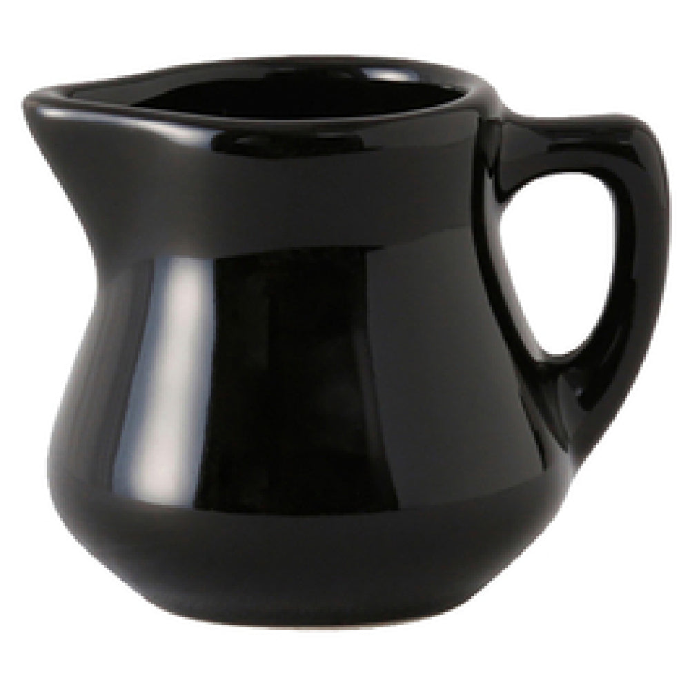The Tuxton BBR-035 Creamer - 3-1/2 oz. - 3-1/2" x 2-3/4"H - is a versatile and durable ceramic creamer designed to meet the diverse needs of the hospitality and foodservice industries. Crafted from fully vitrified ceramic, this creamer guarantees exceptional strength and durability, making it an ideal choice for high-volume environments. Its DuraTux® technology ensures the creamer withstands the demands of daily use, being both microwave and dishwasher safe, as well as oven-proof. The inclusion of a handle adds convenience and ergonomic ease for users, especially in busy settings such as cafes or restaurants. This product is lead-free, emphasizing its safety and suitability for use in establishments that prioritize health standards. The sleek black design of the Tuxton BBR-035 Creamer adds a touch of elegance to any table setting, making it suitable for upscale dining environments as well. Packed by the dozen, this creamer offers practical scalability for businesses that require consistency in their service ware. The Tuxton BBR-035 Creamer's combination of functionality, safety, and aesthetic appeal makes it a valuable asset across various market segments, from casual dining to fine dining establishments.