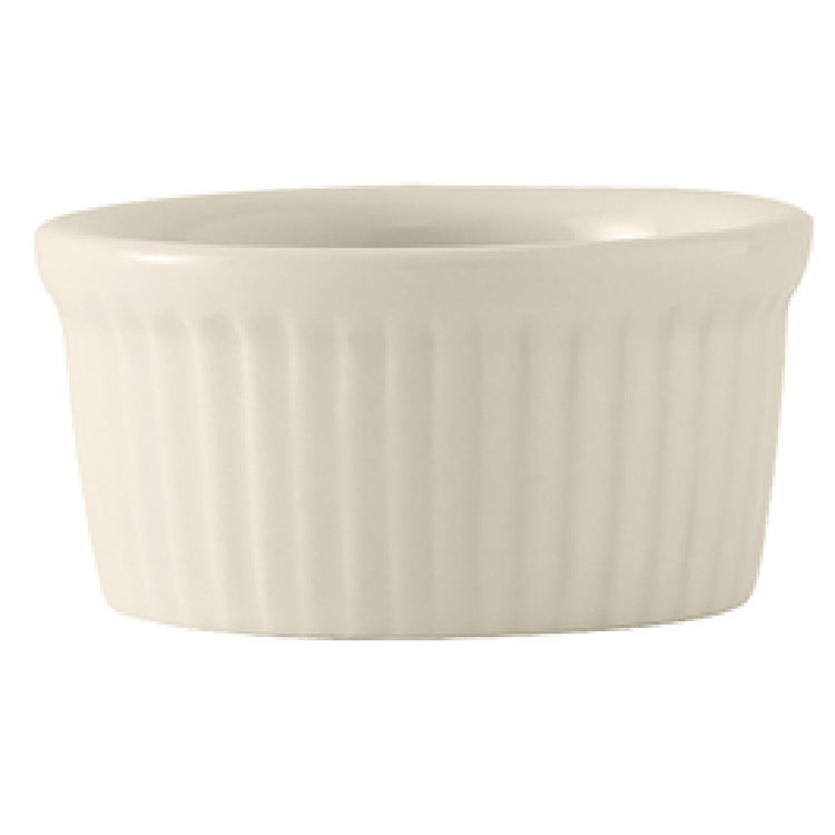 The Tuxton BEX-0552 Ramekin 5-1/2 Oz. 3-5/8" Dia. X 1-3/4"H is a versatile culinary tool designed for both professional kitchens and home chefs who demand exceptional quality and functionality. This round, fluted ramekin has a capacity of 5-1/2 ounces, with dimensions measuring 3-5/8 inches in diameter and 1-3/4 inches in height, making it suitable for a variety of culinary applications ranging from serving dips and sauces to baking individual desserts. Crafted from fully vitrified, lead-free ceramic, this ramekin boasts impressive durability and resistance to thermal shock, ensuring it is microwave and dishwasher safe, as well as oven proof. The American White/Eggshell finish enhances its aesthetic appeal, seamlessly integrating with diverse table settings. The DuraTux®© construction signifies superior strength and resilience, ideal for high-volume foodservice environments. Packed by 4 dozen per case, this product is a pragmatic choice for restaurants, catering services, and hospitality sectors looking to standardize their kitchenware. The Tuxton BEX-0552 Ramekin exemplifies a commitment to quality and reliability, making it a valuable addition to any culinary establishment seeking high-performance dishware that complements their service and presentation standards.