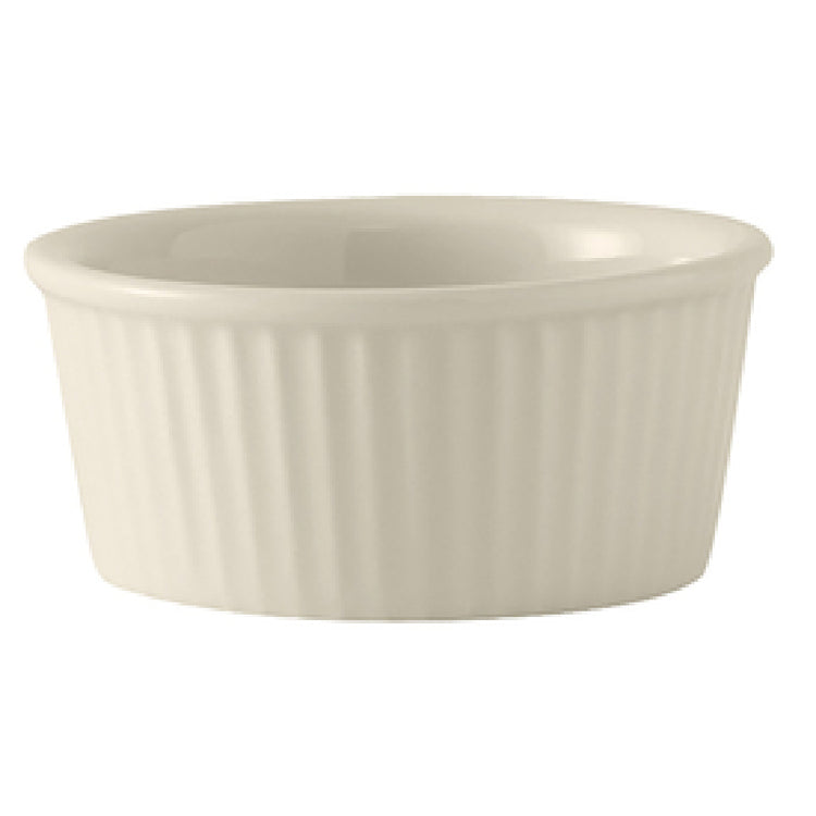 The Tuxton BEX-0602 Ramekin is a versatile 6 oz. dish with a 3-3/4" diameter and a height of 1-3/4", perfect for various culinary applications. Crafted in a classic round shape with a fluted design, it combines style with functionality, making it suitable for presentation in both casual and fine dining settings. This ramekin is constructed from fully vitrified ceramic, ensuring durability and resistance to chipping and scratching, while also being lead-free for safe use. The DuraTux® technology enhances its robustness, making it an ideal choice for high-volume food service environments. Available in an elegant American White/Eggshell hue, it complements any table setting, adding a touch of sophistication. Its microwave, dishwasher, and oven-proof capabilities make it highly practical for busy kitchens, allowing for seamless transitions from cooking to serving to cleaning. The Tuxton BEX-0602 Ramekin is packed by four dozen per case, which is beneficial for restaurants and catering businesses that require bulk quantities. This ramekin exemplifies a blend of aesthetic appeal and functional performance, making it a valuable addition to any food service operation seeking quality and reliability in their serveware.