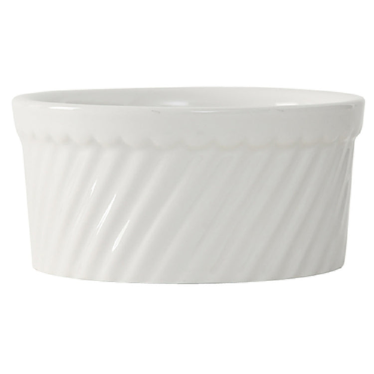 The Tuxton BEX-1204 Soufflé 12 Oz. 4-5/8" Dia. X 2-1/4"H dish is designed for culinary professionals seeking reliability and versatility in their kitchenware. This round, swirl-patterned dish is made from fully vitrified ceramic, ensuring durability and a lead-free composition, which is critical for maintaining food safety standards. With a generous 12 oz. capacity, it is perfect for preparing and presenting individual soufflés and other baked dishes. The dimensions of 4-5/8 inches in diameter and 2-1/4 inches in height provide a balanced structure for even cooking and aesthetic presentation. The Tuxton BEX-1204 is crafted under the DuraTux brand, known for its strength and long-lasting quality. It is microwave and dishwasher safe, adding convenience to the cooking and cleaning process, and oven proof, allowing it to withstand high temperatures during baking. Available in an elegant American White/Eggshell finish, it complements a variety of table settings and stylistic preferences. Packed by 2 dozen per case, this product is ideal for restaurants and catering services that require bulk quantities without compromising on quality. The Tuxton BEX-1204 Soufflé dish combines functionality and style, making it a valuable addition to any professional kitchen environment.