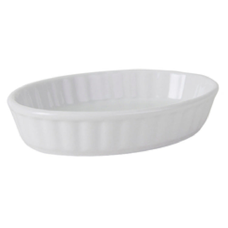 The Tuxton BPK-0502 Crème Brule dish is a meticulously crafted piece of serveware with a 5 oz. capacity, offering a practical solution for food service establishments specializing in desserts and fine dining. Its dimensions of 5-3/8" x 3-7/8" x 1-1/8"H accommodate a variety of culinary presentations, while its oval, fluted design adds an elegant touch to any table setting. This dish is engineered to withstand the rigors of professional kitchens, being microwave and dishwasher safe, making it suitable for both preparation and cleanup processes. Furthermore, its oven-proof nature allows it to be used directly in cooking applications, enhancing its versatility. The fully vitrified porcelain construction ensures that the dish is lead-free and maintains superior durability and resistance to chipping, which is ideal for high-volume usage. Manufactured under the DuraTux® trademark, the dish is presented in a classic Porcelain White finish, ensuring it complements a wide range of tableware collections. The Tuxton BPK-0502 is packaged by the dozen, making it a cost-effective choice for restaurants, hotels, and catering services aiming for consistency and quality in their presentation. This product represents a harmonious blend of aesthetic appeal and functional robustness, meeting the diverse needs of the food service industry.