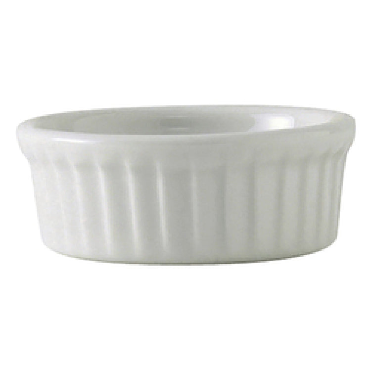 The Tuxton BPX-0162 Ramekin - 1-1/2 Oz - 2-5/8" Dia - 1"H is a versatile and durable serving solution, ideal for various segments within the food service industry. Crafted from high-quality, fully vitrified porcelain, this ramekin ensures superior strength and longevity. Its round, fluted design adds an elegant touch to any dining setting, enhancing the presentation of sauces, dips, and condiments. With a diameter of 2-5/8 inches and a height of 1 inch, this compact ramekin has a capacity of 1-1/2 ounces, making it perfect for portion control. The porcelain white finish complements a wide range of table settings, offering a clean and classic look. This ramekin is microwave and dishwasher safe, providing convenience and ease of use in fast-paced environments. Its oven-proof construction allows for versatile cooking applications, from baking to broiling. The product is lead-free, ensuring safety and compliance with health standards. Featuring the renowned DuraTux® technology, this ramekin guarantees resistance to wear and tear, making it a reliable choice for both commercial and residential kitchens. Packed by 4 dozen per case, the Tuxton BPX-0162 Ramekin is an exceptional addition to any culinary establishment seeking quality and practicality.