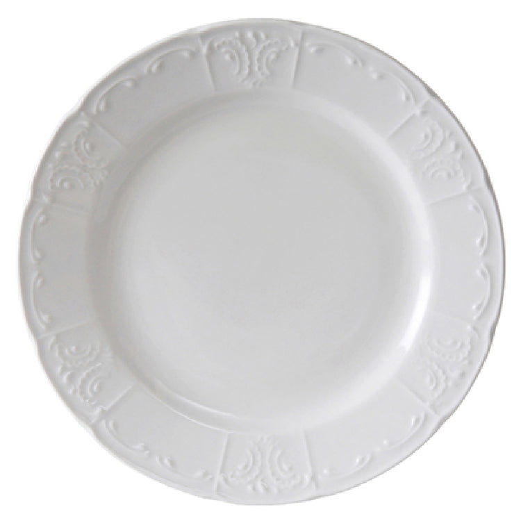 The Tuxton CHA-077 Plate 7-7/8" Dia. Round is a premium choice for food service establishments requiring durability and style. This plate, with a diameter of 7-7/8 inches, features a round shape complemented by a wide rim, enhancing its visual appeal and functionality. Its embossed design adds a touch of elegance, making it suitable for various dining environments from casual to fine dining. Engineered to withstand the demands of a busy kitchen, the plate is microwave and dishwasher safe, ensuring ease of use and maintenance. It is also oven proof, allowing chefs flexibility in presentation and service. Constructed as fully vitrified and lead-free, this plate guarantees longevity and safety, meeting high industry standards. It is available in Porcelain White, a versatile color that complements any table setting. The Tuxton CHA-077 Plate is packed in cases of three dozen, providing ample supply for restaurants, catering services, and event planners. Its robust construction and sophisticated design make it an indispensable asset in the hospitality industry, offering consistent quality and style for diverse market segments.