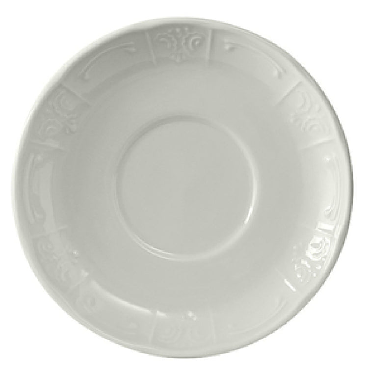 The Tuxton CHE-044 Demitasse Saucer 4-1/2" Dia. Round is a premium porcelain saucer designed for versatility across various segments within the culinary and hospitality industries. With a diameter of 4-1/2 inches, this round saucer is embossed, adding an elegant touch to its aesthetic appeal. It is fully vitrified, ensuring a non-porous surface that enhances its durability and makes it resistant to chipping. Its lead-free composition contributes to a safer dining experience, aligning with health standards. The saucer's DuraTux® technology highlights its robust construction, making it microwave and dishwasher safe, and capable of withstanding oven temperatures without compromising its integrity. Packed by 3 dozen per case, this product is ideal for high-volume settings such as cafes, restaurants, and hospitality venues in need of reliable and stylish serviceware. Its Porcelain White finish complements a wide range of table settings, offering a classic and versatile appearance. Manufactured under the Chicago line, this saucer meets the demands of professional environments, ensuring both functional and aesthetic excellence. The Tuxton CHE-044 Demitasse Saucer is a leading choice for those seeking a balance of style, durability, and practicality in their serviceware solutions.