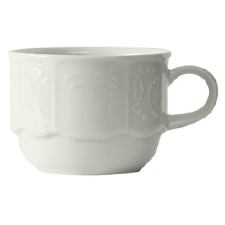 The Tuxton CHF-030 Demitasse Cup 3 Oz. - 2-5/8" Dia. X 1-7/8"H is a compact and practical choice for coffee enthusiasts and professionals in the hospitality industry, particularly suited for serving espresso or other small beverages. Crafted with a focus on durability and practicality, this demitasse cup is fully vitrified, ensuring a non-porous surface that contributes to its exceptional strength and resistance to chipping. The lead-free composition underscores its safety for daily use, while the embossed design adds a touch of elegance. Its stackable feature allows for efficient storage, making it an excellent fit for both small and large-scale operations. The cup's Porcelain White color offers a classic and versatile aesthetic, suitable for various table settings. It is microwave and dishwasher safe, which enhances its convenience in fast-paced environments, and its oven-proof capability extends its utility in diverse culinary applications. The Tuxton CHF-030 is part of the DuraTux® line, known for its robustness and quality, and is packaged in cases of three dozen, providing a cost-effective solution for high-volume usage in restaurants, cafes, and hotels. With its thoughtful design and reliable performance, this demitasse cup meets the demands of various market segments within the food and beverage industry.