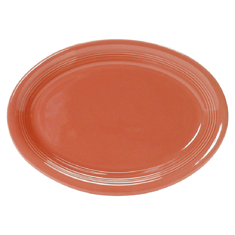 The Tuxton CNH-0962 Platter 9-3/4" X 7" Oval is a versatile and durable piece of dinnerware, ideal for various segments within the food service industry. This oval platter is designed with a coupe shape, providing a sleek and modern presentation for culinary creations. Measuring 9-3/4 inches by 7 inches, it offers ample space for serving a range of dishes, from appetizers to entrees. The platter is constructed from fully vitrified ceramic, ensuring it is lead-free and safe for diverse dining environments. Notably, it is microwave and dishwasher safe, offering convenience and efficiency for busy kitchens. Additionally, the platter is oven proof, making it suitable for both cooking and serving purposes. The Concentrix® design in Cinnebar adds an aesthetic appeal that enhances table settings across casual and formal dining experiences. This product is packed by 2 dozen per case, catering to large-scale dining establishments such as restaurants, hotels, and catering services. The Tuxton CNH-0962 Platter combines practicality and elegance, making it a valuable addition to any professional kitchen's dinnerware collection.