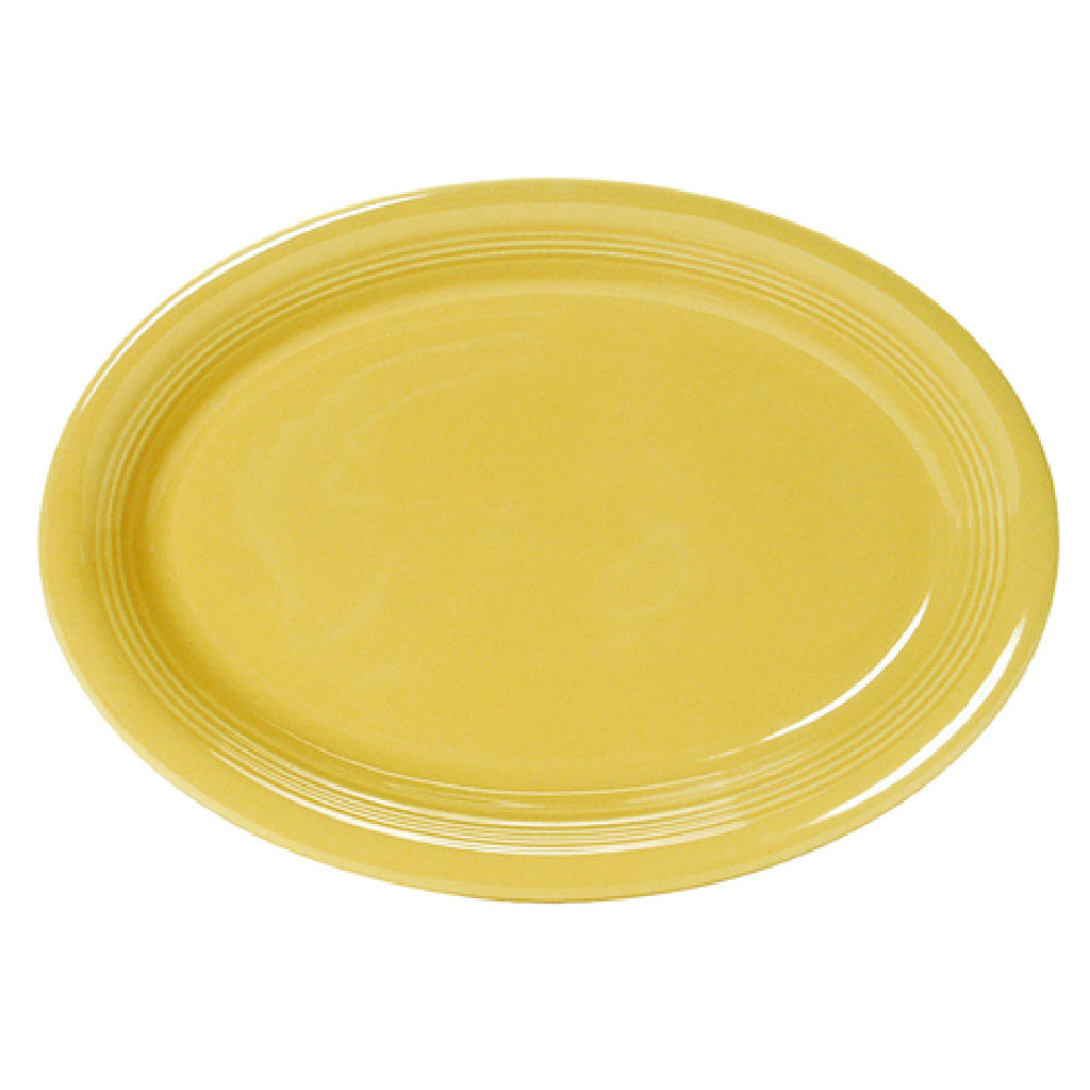The Tuxton CSH-0962 Platter - 9-3/4" x 7" Oval is a versatile dining solution designed to meet the needs of various segments within the food service industry. Measuring 9-3/4 inches in length and 7 inches in width, this oval-shaped platter is part of the Concentrix® series. Its coupe style adds a modern touch to its design, making it suitable for both casual and formal dining settings. The platter is microwave and dishwasher safe, ensuring convenience in fast-paced kitchen environments. It is also oven-proof and fully vitrified, which enhances its durability and resistance to thermal shock, making it an excellent choice for both hot and cold dishes. The construction from lead-free ceramic guarantees food safety, a critical consideration for health-conscious consumers and establishments. The Saffron color brings a vibrant and warm aesthetic to tabletops, easily complementing a wide range of decor styles. Packed by 2 dozen per case, the Tuxton CSH-0962 Platter is an efficient and practical option for restaurants, hotels, and catering services looking for reliability and quality. Its thoughtful design and functionality cater to professional chefs and hospitality professionals seeking robust and stylish serveware solutions.
