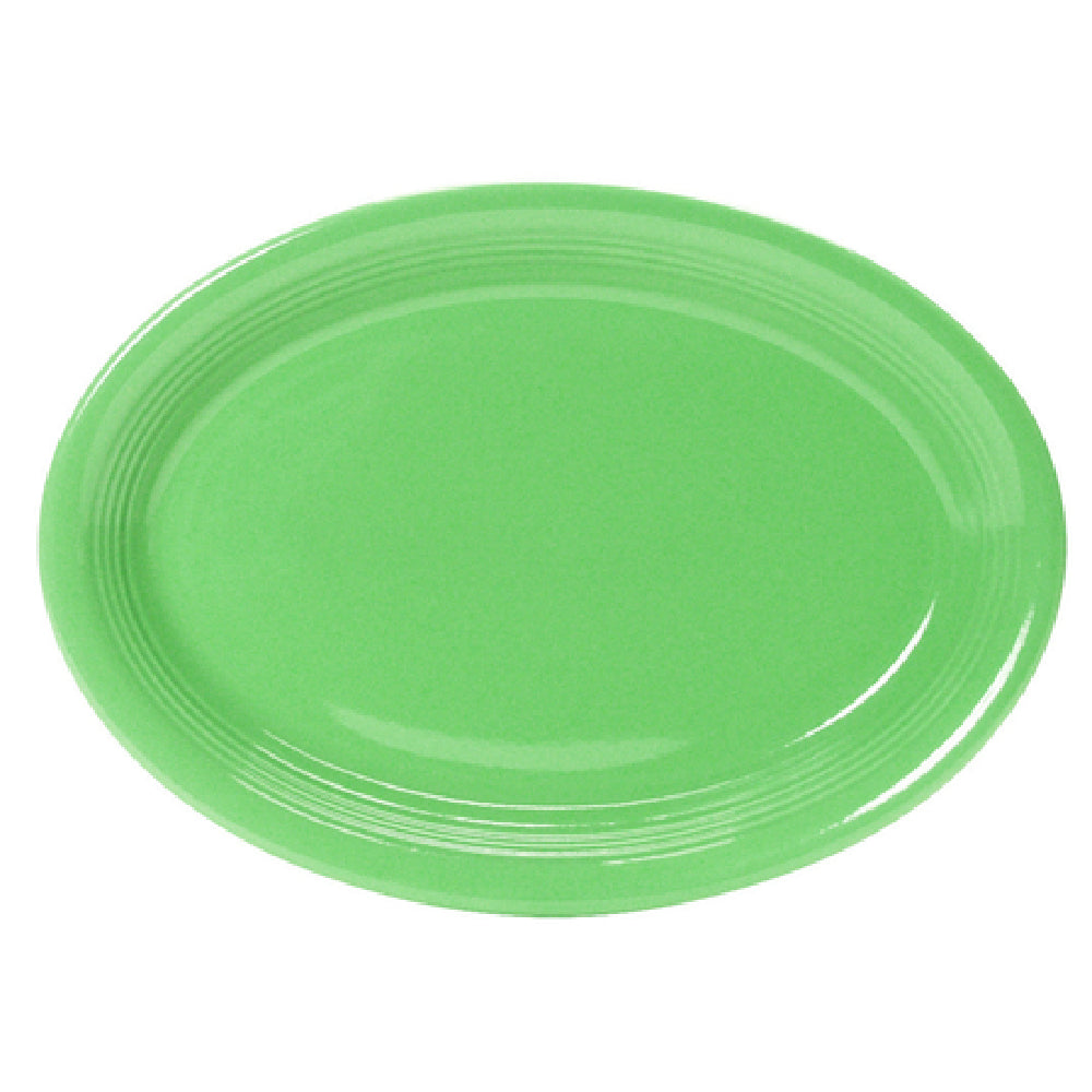 The Tuxton CTH-1352 Platter 13-1/2" X 9-3/4" Oval is a versatile dining accessory that perfectly combines functionality and elegance. This oval coupe platter is crafted from fully vitrified ceramic, ensuring durability and a long-lasting shine. Measuring 13-1/2 inches by 9-3/4 inches, it offers ample space for serving a variety of dishes, making it an excellent choice for both casual dining and formal occasions. The platter is microwave and dishwasher safe, providing convenience and ease of use in any kitchen setting. Additionally, it is oven-proof, allowing for seamless transitions from cooking to serving. Lead-free construction underscores its safety and quality, catering to health-conscious consumers. Part of the Concentrix® collection in a striking Cilantro color, this platter brings a touch of sophistication to any table setting. It is packed by 6 each per case, making it suitable for restaurant and hospitality industries where bulk purchase and efficiency are paramount. The Tuxton CTH-1352 Platter is a product that meets the needs of diverse market segments within the food service industry, appreciated for its practical features and aesthetic appeal.