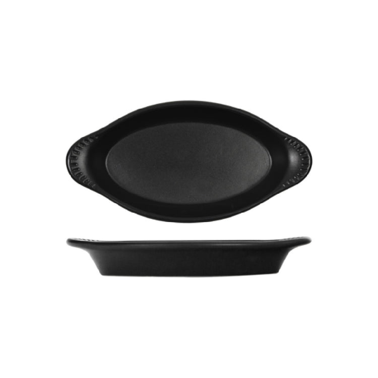Tuxton China, DBN-120, Welsh Rarebit, 12-fluid ounce, 4.875"W x 9.875"D x 1.375"H, vitrified china, chip resistant, coloured, commercial use, decorated, dishwasher safe, freezer safe, fully vitrified, lead & cadmium free, microwave safe, oven safe, safe for food use, scratch resistant, stackable, Forge, black (refer to tuxton.com for full warranty policy) (Packed By: 1 Dozen)