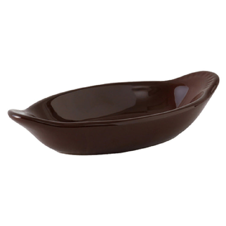 The Tuxton DMN-045 Welsh Rarebit is a durable and versatile serving dish, designed specifically for culinary professionals and home chefs alike. With a capacity of 4-1/2 oz., this dish is perfect for individual servings, making it an ideal choice for restaurants looking to offer personalized dining experiences. Measuring 6-3/4" x 3-5/8" x 1-3/8"H, it fits seamlessly into any kitchenware collection. The oval shape not only adds an elegant touch to your presentation but also optimizes space for a variety of dish types. This product is microwave and dishwasher safe, providing convenience for fast-paced kitchen environments. Its oven-proof capability enhances its versatility, allowing dishes to be prepared and served in the same vessel, thus reducing cleaning time and effort. Fully vitrified, this lead-free ceramic dish meets high safety standards, ensuring food safety and durability. The DuraTux® technology it incorporates guarantees a robust performance, standing up to the rigors of daily use. Finished in a rich Mahogany color, it adds a touch of sophistication to any table setting. Packed by the dozen, the Tuxton DMN-045 Welsh Rarebit is an economical and stylish solution for food service establishments and home gourmets, merging functionality with aesthetic appeal.
