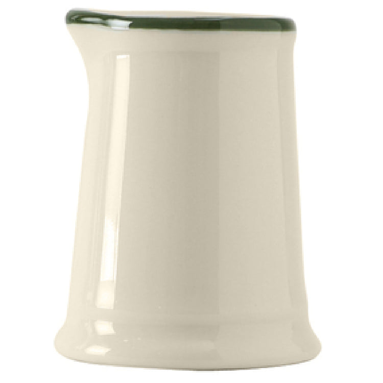 The Tuxton DNR-0351 Creamer 3-1/2 Oz. 2-1/8" X 3"H is a compact and durable ceramic creamer meticulously crafted to meet the needs of the hospitality industry. This creamer, with a capacity of 3-1/2 ounces, is designed without a handle, offering a sleek and modern aesthetic. Measuring 2-1/8 inches in diameter and 3 inches in height, it fits seamlessly on any tabletop setting. The product is microwave and dishwasher safe, highlighting its adaptability and ease of cleaning, while also being oven-proof, allowing for diverse serving applications. Fully vitrified, this creamer ensures high resistance to chipping and thermal shock, making it a resilient choice for high-traffic environments. The Tuxton DNR-0351 is lead-free, prioritizing customer safety and health. Its eggshell color, accented with a green band, provides a classic yet vibrant touch suitable for upscale restaurants, cafes, and catering services. The DuraTux® brand line emphasizes durability and quality, ensuring long-lasting performance. Packed by the dozen, this creamer is an economical choice for businesses seeking reliable and stylish service ware. Its unique features make it a versatile option for diverse segments in the food service industry, from casual dining to fine dining establishments.
