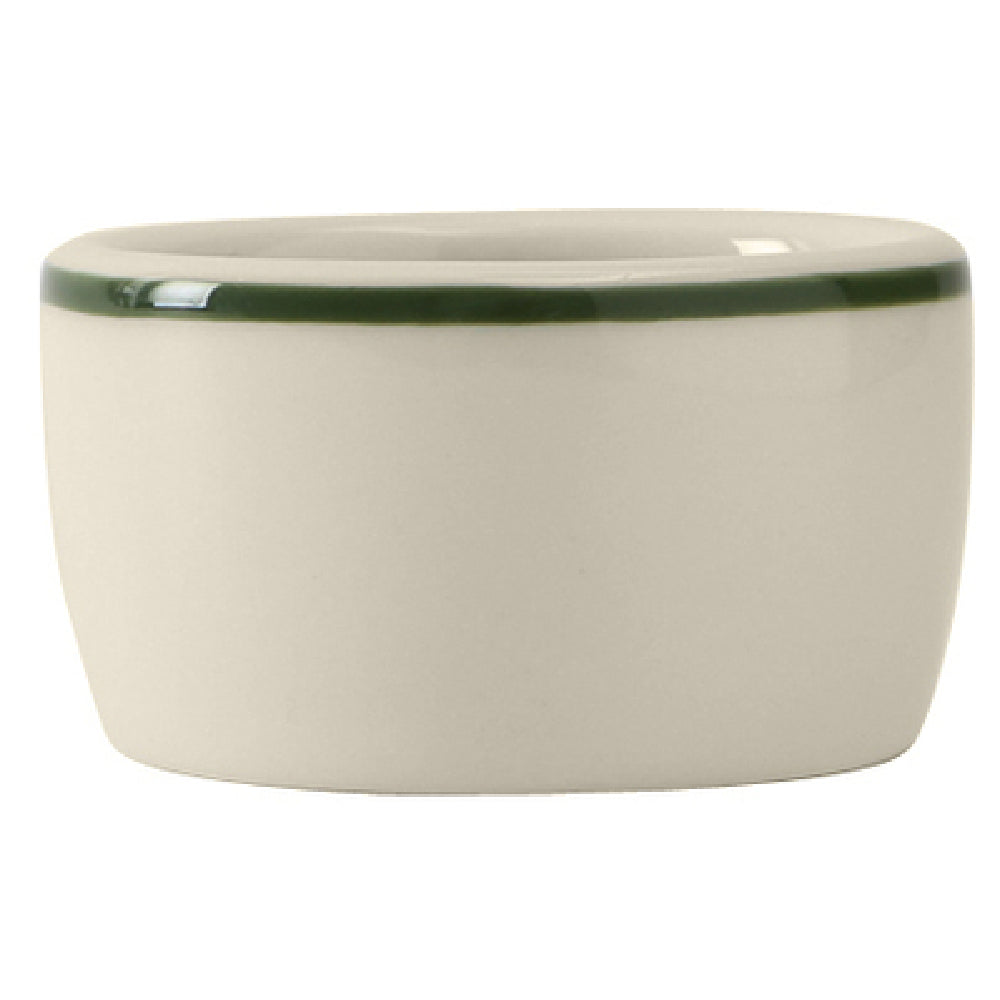 The Tuxton DNX-0203 Ramekin/Cheese Pipkin is a versatile 2 oz. capacity serving solution with precise dimensions of 2-1/2 inches in diameter and 1-3/8 inches in height. This round ceramic ramekin is crafted from fully vitrified material, ensuring its durability and resilience in various culinary environments. It is lead-free, reinforcing its safety for food service. The ramekin's eggshell color with a green band adds a touch of elegance to any presentation. Designed for practicality, the Tuxton DNX-0203 is both microwave and dishwasher safe, making it a convenient choice for busy kitchens. Its oven-proof nature allows for versatile cooking and serving options, catering to the needs of professional chefs in restaurants and catering services as well as home cooks seeking quality serveware. The DuraTux® mark signifies its robust construction, suitable for high-frequency use. With packaging of 4 dozen per case, it is ideal for establishments requiring large quantities. The Tuxton DNX-0203 Ramekin/Cheese Pipkin stands out as a reliable and stylish choice in the food service industry, offering functionality and design for a range of culinary applications.