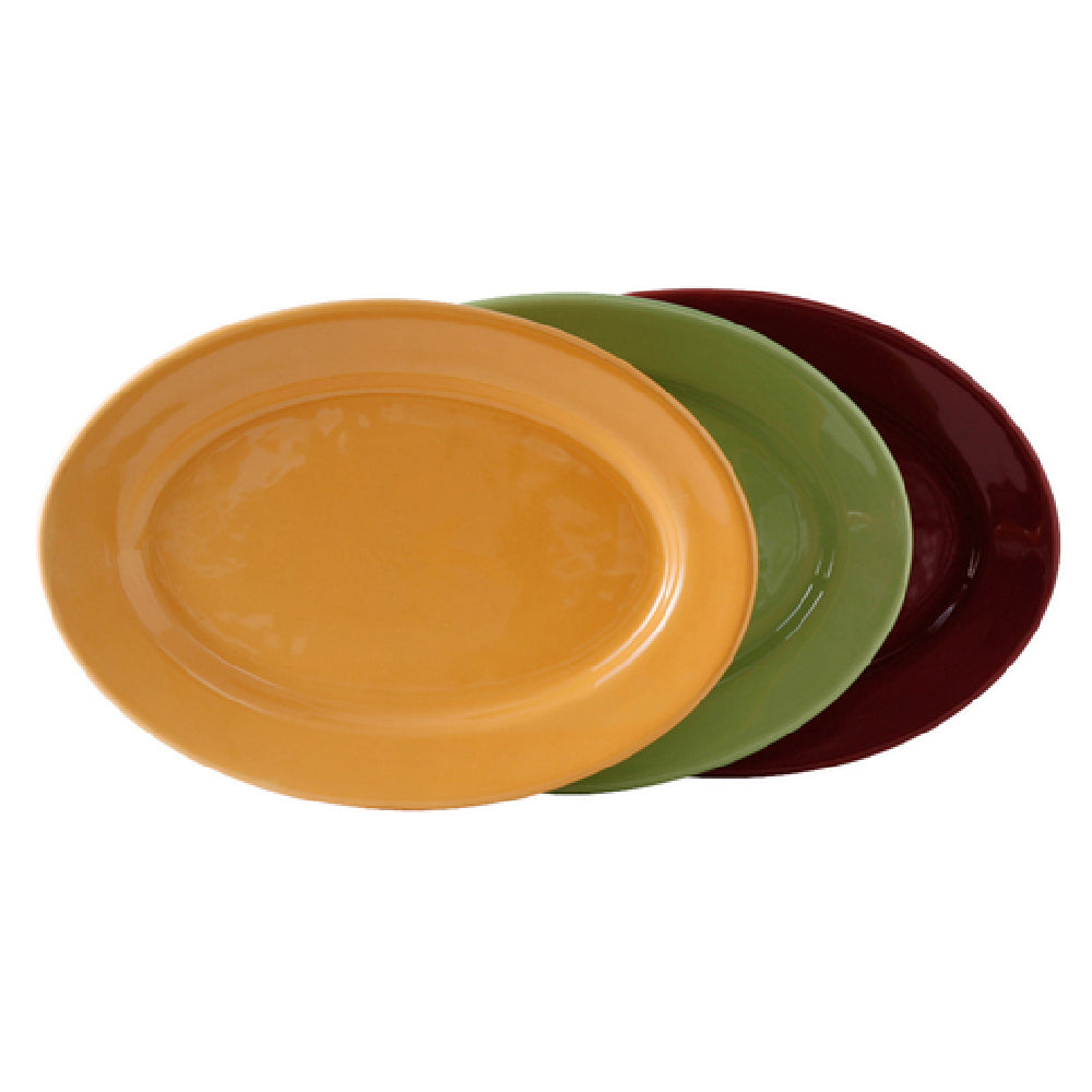 The Tuxton DYH-140 Platter 14-1/8" X 10-1/4" X 1-1/2" H Oval is a meticulously crafted piece that combines functionality with elegance, designed for versatility in various dining environments. This platter features a wide rim that not only adds a touch of sophistication but also ensures easy handling and serving. As a fully vitrified ceramic item, it boasts exceptional durability, being lead-free and safe for use in both microwave and dishwasher, making it a practical choice for busy kitchens. Additionally, its oven-proof nature broadens its utility, catering to a range of culinary applications. The DuraTux® technology guarantees a resilient surface, resistant to chipping and thermal shock, ideal for heavy-duty use in commercial settings. Available in an array of colors – Butterscotch, Pistachio, Cranberry – the platter provides aesthetic versatility, allowing establishments to enhance their table settings with a pop of color. Each dozen is packed with four platters of each color, supporting diverse presentation styles. The Tuxton DYH-140 Platter is an exemplary choice for hotels, restaurants, and catering services seeking reliable and stylish serveware that meets the high demands of the foodservice industry.