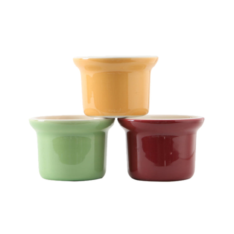 Tuxton DYS-0805 Petite Marmite 8 Oz. 4" Dia. X 2-7/8"H is a finely crafted piece of ceramic cookware, ideal for both professional and home kitchens. With a capacity of 8 ounces and dimensions measuring 4 inches in diameter and 2-7/8 inches in height, this petite marmite is perfectly suited for serving individual portions of soups, stews, or side dishes. The ceramic material is fully vitrified, ensuring a non-porous surface that is both durable and resistant to chipping. This product is lead-free, meeting safety standards, and is part of the DuraTux collection, known for its resilience in high-volume use. Its ability to withstand microwave, dishwasher, and oven environments adds to its practicality, allowing for versatile cooking and easy cleaning. Available in a range of assorted colors - Butterscotch, Cranberry, and Pistachio - it adds a touch of elegance and variety to table settings. Packed by the dozen, the Tuxton DYS-0805 is a practical choice for establishments such as restaurants, catering services, or for personal use by culinary enthusiasts who value quality and functionality in their kitchenware. Its robust build and stylish design make it a reliable and aesthetically pleasing choice for various culinary applications.