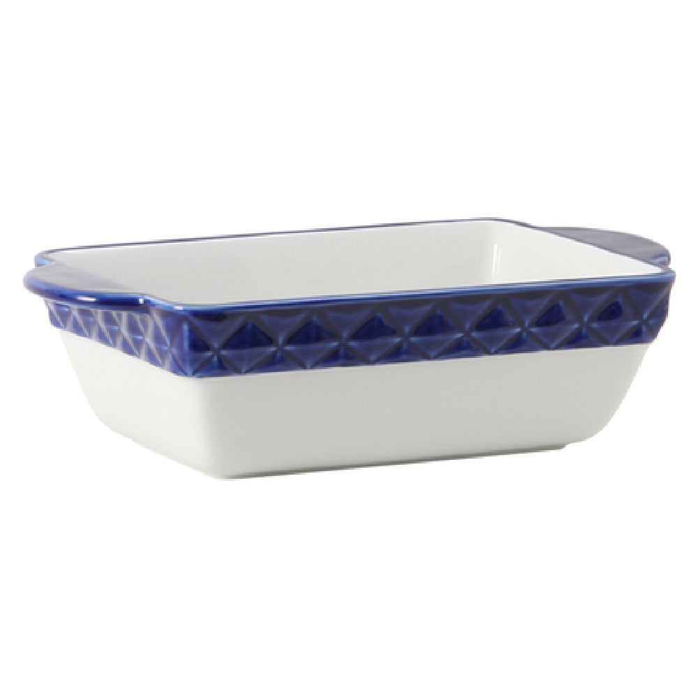 The Tuxton EAC-202 Casserole Dish 1-1/2 Qt. 11"L X 6"W X 3"H (9"L Without Handle) is a versatile kitchen essential prized for its combination of style and functionality. This rectangular casserole dish, subtly embossed, is designed without a lid, offering flexibility and ease of use across varied culinary applications. Measuring 11 inches in length with handles (reduced to 9 inches without handles), 6 inches in width, and a height of 3 inches, it provides a generous 1-1/2 quart capacity suitable for individual or family-sized meals. Manufactured with a focus on durability, the dish is fully vitrified and lead-free, ensuring long-lasting performance and safety in food preparation. Its Porcelain White finish, accented by a Cobalt Band, lends a touch of elegance to any table setting, while its compatibility with microwave, dishwasher, and oven reinforces its practical value in both residential and commercial kitchen settings. The Tuxton EAC-202 is part of the DisplayTux® collection, known for combining aesthetic appeal with dependable utility, making it an ideal choice for restaurants, catering services, or home cooks who value refined dining experiences. Packed by two per case, this casserole dish is a reliable addition to any culinary toolkit.