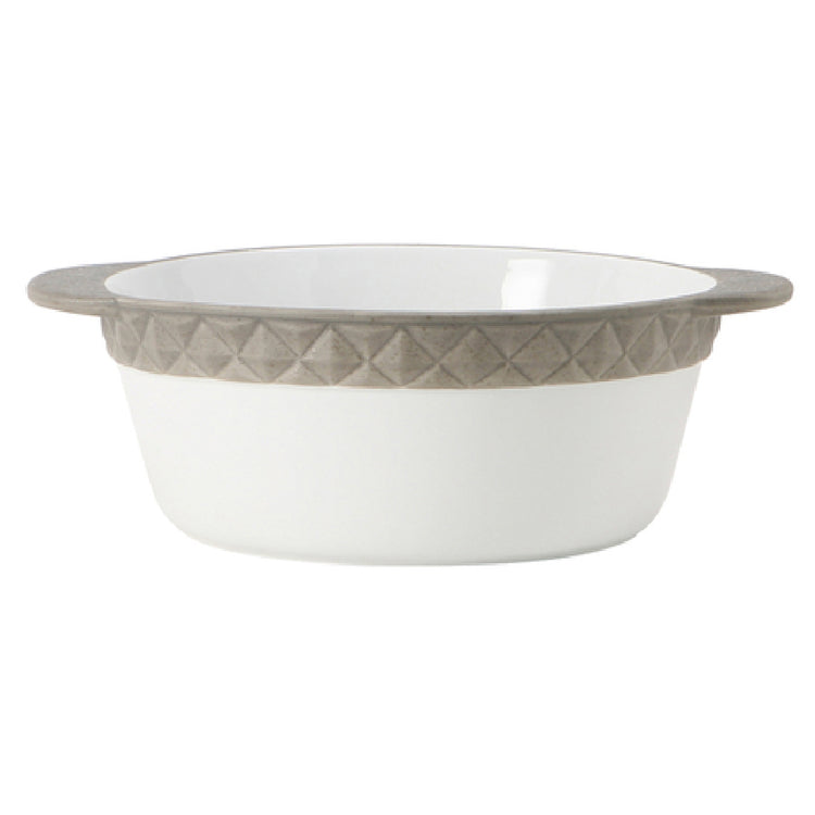 The Tuxton EAF-301 Casserole Dish 3-1/2 Qt. 12" Dia. X 4"H (10" Dia. Without Handle) is a versatile kitchen essential designed for both professional and home chefs seeking quality and functionality. This round casserole dish has a generous capacity of 3-1/2 quarts, making it ideal for preparing a variety of dishes. Measuring 12 inches in diameter and 4 inches in height, or 10 inches in diameter without the handle, it offers ample space for cooking and serving. The dish is embossed, adding an aesthetic touch to its Porcelain White finish with a Black Truffle Band, making it a stylish addition to any table setting. Engineered for durability, this casserole dish is microwave and dishwasher safe, ensuring easy cleaning and convenience in busy kitchen environments. It is also oven proof and fully vitrified, meaning it can withstand high temperatures without compromising its structural integrity. The dish is lead-free, aligning with safety standards for food contact materials. Packaged two per case, the Tuxton EAF-301 is an excellent choice for catering services, restaurants, or cooking enthusiasts who prioritize both form and function in their kitchenware.