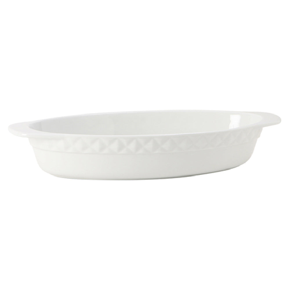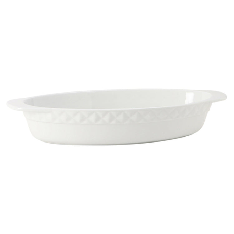 The Tuxton EAP-101 Casserole Dish is a versatile kitchen essential, designed with precision for culinary professionals and home cooks alike. With a generous capacity of 3-1/2 quarts, this oval dish measures 17-3/4 inches in length, 8-1/2 inches in width, and 3 inches in height, providing ample space for a variety of dishes. The length without the handle is 15-3/4 inches, making it a perfect fit for compact storage or efficient serving presentations. Crafted from high-quality porcelain, this casserole dish features an embossed design, enhancing its aesthetic appeal for display purposes. It is microwave and dishwasher safe, ensuring ease of use and maintenance, while its oven-proof and fully vitrified construction guarantees durability and resistance to chipping. The dish is lead-free, meeting safety standards for food preparation. The elegant Porcelain White with a White Band finish adds a touch of sophistication to any table setting. Packed in sets of two per case, the Tuxton EAP-101 Casserole Dish is an ideal choice for catering, hospitality, and home use, offering reliable performance and a stylish presentation in any culinary environment.