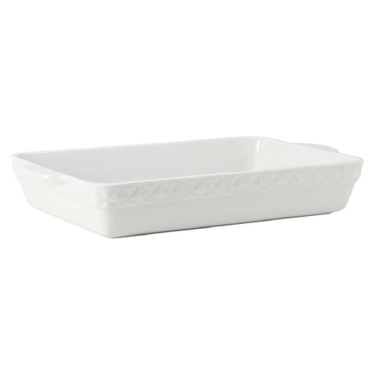 The Tuxton EAP-201 Casserole Dish is a versatile kitchen essential, offering a generous capacity of 6-1/4 quarts, making it suitable for a variety of culinary applications. This rectangular dish measures 18-1/2 inches in length, 11 inches in width, and 3 inches in height, with the length reducing to 16-1/2 inches when excluding the handle. Crafted from high-quality porcelain, it features a sophisticated embossed design and a classic Porcelain White finish with a subtle white band, ensuring it complements any kitchen decor. The dish is both microwave and dishwasher safe, providing convenience in food preparation and cleanup. It is also oven proof and fully vitrified, ensuring durability and resistance to chipping or cracking under high temperatures. The lead-free composition underscores its commitment to safety and health standards. Designed without a lid, the Tuxton EAP-201 is ideal for both professional chefs and home cooks looking for a reliable and stylish casserole dish. Packed as 2 per case, it is a practical addition to any commercial or domestic kitchen, suitable for catering, restaurants, or home use, offering exceptional functionality and a timeless aesthetic.