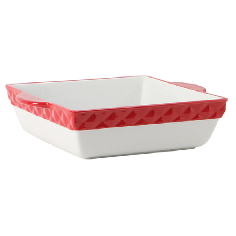 The Tuxton EAQ-401 Casserole Dish 3-1/4 Qt. 12"L X 10"W X 3"H (10"L Without Handle) is a versatile kitchen essential for both professional chefs and home cooks. With a generous capacity of 3-1/4 quarts, this square dish is designed to accommodate a variety of baking and serving needs. Measuring 12 inches in length, 10 inches in width, and 3 inches in height, it provides ample space for your culinary creations, while the length without the handle is 10 inches, making it easy to store. The dish is embossed and constructed from fully vitrified porcelain, ensuring it is lead-free and safe for everyday use. Its durable build is both microwave and dishwasher safe, offering convenience for busy kitchens. Additionally, the Tuxton EAQ-401 is oven-proof, making it ideal for baking and roasting. The Porcelain White finish with a distinctive Cayenne Band adds an elegant touch to any dining presentation. Each case contains two of these high-quality dishes, making them perfect for restaurants, catering services, or large family gatherings. The Tuxton EAQ-401's unique combination of aesthetics and practicality makes it a valuable addition to any kitchen setting, whether in a commercial or residential environment.