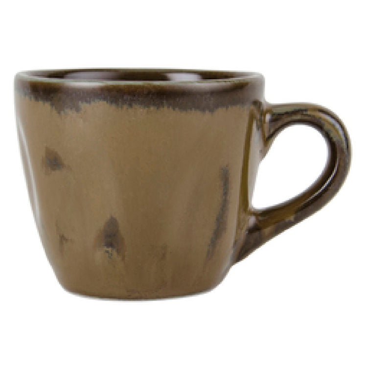 The Tuxton GAJ-085 Espresso Cup 3-1/2 Oz. 2-5/8" Dia. X 2-1/4"H is a meticulously crafted ceramic cup designed for discerning beverage enthusiasts and professional settings alike. With a compact capacity of 3-1/2 ounces, this espresso cup is perfect for serving a precisely measured shot of espresso. The dimensions of 2-5/8 inches in diameter and 2-1/4 inches in height, along with a conveniently designed handle, ensure a comfortable grip, enhancing the drinking experience. Manufactured under the TuxTrendz® Artisan Mojave collection, this cup features a fully vitrified and lead-free construction, ensuring durability and safety for everyday use. The cup is both microwave and dishwasher safe, offering ease of use and maintenance in fast-paced environments. Its oven-proof nature further broadens its utility in culinary settings. The product is packed by 2 dozen per case, catering to the needs of cafes, restaurants, and hospitality services that require bulk quantities. The Tuxton GAJ-085 stands out in its category for its combination of aesthetic appeal and functional excellence, making it a versatile choice for various industry segments looking for reliable and stylish serveware solutions.