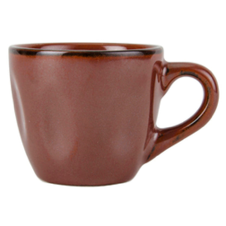 The Tuxton GAR-085 Espresso Cup 3-1/2 Oz. 2-5/8" Dia. X 2-1/4"H is a meticulously crafted piece of ceramic ware designed for both functionality and style. With a capacity of 3-1/2 ounces, this espresso cup is perfectly sized for serving the quintessential espresso shot. Its dimensions, 2-5/8 inches in diameter and 2-1/4 inches in height, reflect an ideal balance between form and function, ensuring a comfortable holding experience with its integrated handle. This cup is microwave and dishwasher safe, offering convenience for both quick reheats and easy cleaning. Additionally, it is oven-proof, expanding its versatility in professional culinary settings. Constructed from fully vitrified, lead-free ceramic, this cup guarantees durability and safety, making it a reliable choice for everyday use in cafes, restaurants, and homes. The Tuxton GAR-085 is part of the TuxTrendz® Artisan collection, featuring the striking Red Rock color, which adds a touch of sophistication to any serving environment. Packed by 2 dozen per case, this product is well-suited for both small-scale and large-scale operations, providing a consistent and stylish solution for serving espresso, while its robust construction ensures long-lasting performance in demanding settings.