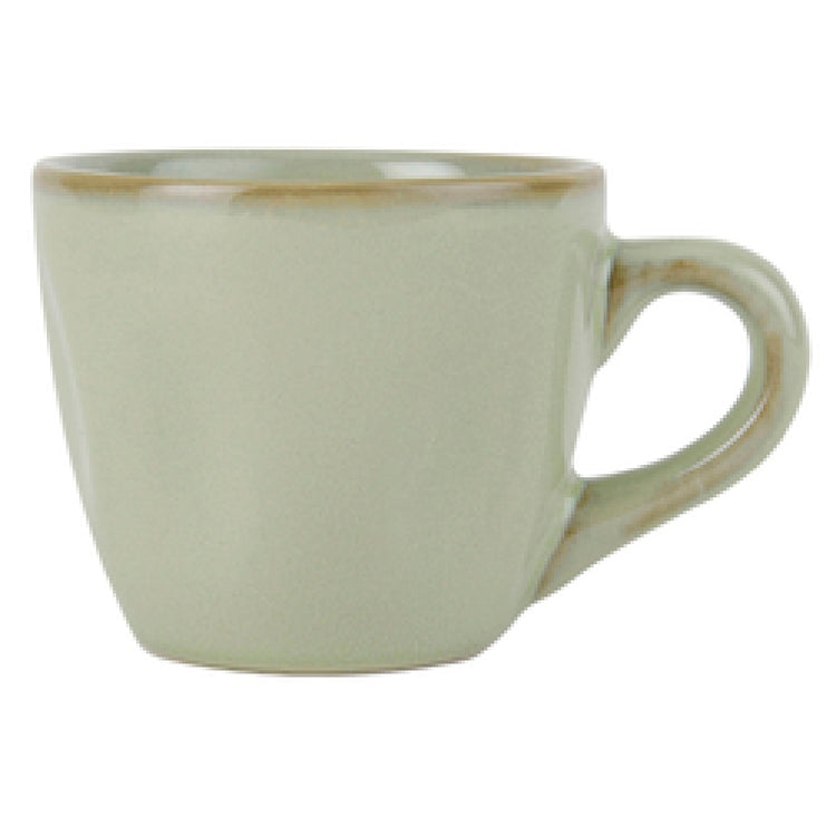 The Tuxton GAS-085 Espresso Cup 3-1/2 oz. 2-5/8" dia. x 2-1/4"H is a meticulously crafted ceramic espresso cup suitable for a variety of applications within the food service industry. With a capacity of 3-1/2 ounces, it is perfect for serving rich espresso and other specialty coffees. The cup measures 2-5/8 inches in diameter and 2-1/4 inches in height, providing a compact and elegant presentation. Featuring a handle for ease of use, this cup is designed for both functionality and style. It is microwave and dishwasher safe, ensuring convenience in fast-paced environments, while its oven-proof property adds versatility for warming beverages. The fully vitrified construction enhances durability and longevity, making it a reliable choice for daily use. Additionally, the lead-free composition aligns with health standards, ensuring safety for consumers. Part of the TuxTrendz® Artisan collection in the distinctive Sagebrush color, it adds a touch of sophistication to any setting. Suitable for use in cafes, restaurants, and hotels, this espresso cup is packaged by 2 dozen per case, making it an efficient option for bulk purchasing. Its quality and versatility make it an excellent choice for establishments seeking both functionality and aesthetic appeal.