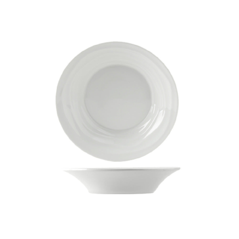 The Tuxton GDP-062 Soup Bowl is a meticulously crafted piece of tableware, offering a capacity of 14 oz. and measuring 9 inches in diameter by 1-7/8 inches in height. Its round, rimmed design contributes to both aesthetic appeal and functional convenience, making it an ideal choice for food service professionals and home chefs alike. Constructed with fully vitrified porcelain, this bowl ensures durability and resistance to both chipping and cracking, thereby enhancing its lifespan in high-usage environments. As a lead-free product, it prioritizes user safety while aligning with health standards. The Tuxton GDP-062 is not only microwave and dishwasher safe but also oven proof, allowing for versatile uses ranging from heating to serving. A part of the TuxTrendz collection in Sandbar and Porcelain White, it seamlessly integrates into various dining settings, from casual to upscale. This soup bowl comes packed by 2 dozen per case, catering to bulk purchasing needs of restaurants, catering services, and other hospitality sectors. Its combination of practicality and design excellence makes it a valuable addition to any kitchen or dining operation seeking reliable and stylish serveware solutions.