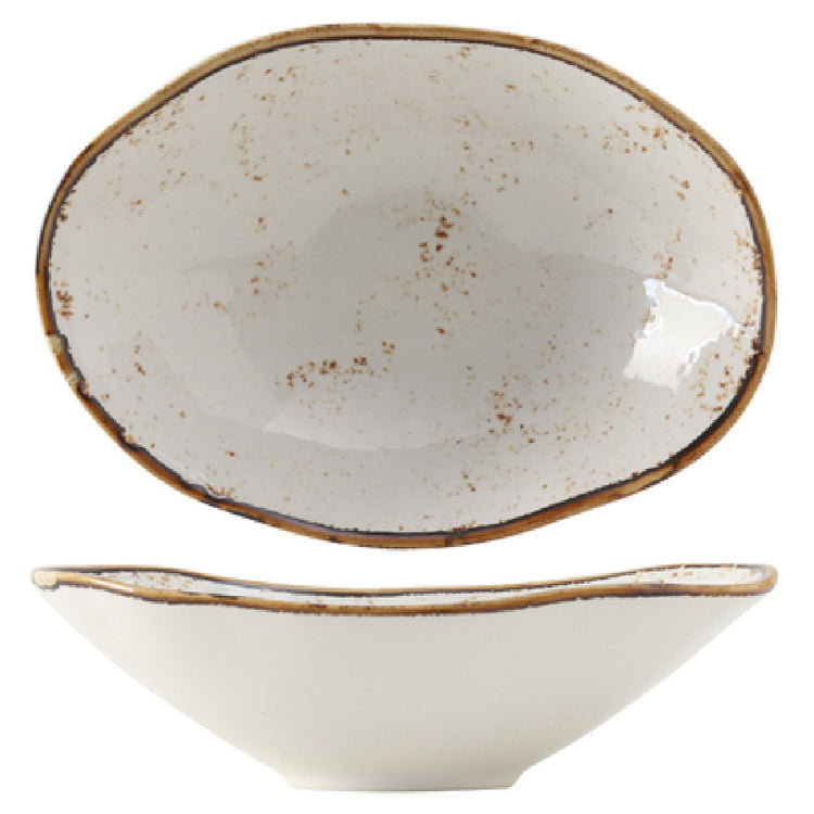 The Tuxton GGA-402 Capistrano Bowl is a meticulously crafted porcelain dish that holds 11-1/2 oz., making it ideal for serving a variety of dishes across different market segments such as hospitality, catering, and home dining. With dimensions of 7-1/2" x 5-1/4" x 2-1/4"H, this oval-shaped bowl offers ample serving space while maintaining a sleek profile. Its full vitrification process ensures a high degree of durability and resistance to chipping, making it a reliable choice for high-traffic environments. The lead-free composition underscores its safety and environmental considerations, while the microwave and dishwasher-safe features enhance convenience in any fast-paced kitchen setting. This Tuxton China product, part of the TuxTrendz® Artisan Geode line in the Agave color, not only provides functional benefits but also adds an aesthetic touch to any table setting. Designed to be oven-proof, the Capistrano Bowl can seamlessly transition from kitchen prep to table presentation. Packed by the dozen, it caters to larger-scale service needs, making it a practical option for restaurants and event caterers. The Tuxton GGA-402 Capistrano Bowl embodies a blend of practicality, safety, and style, making it a valuable addition to any culinary collection.