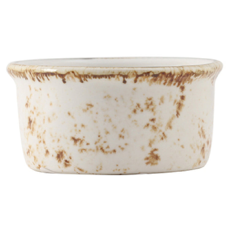 The Tuxton GGA-752 Ramekin 2-1/2 Oz. 3" Dia. X 1-1/2"H is a versatile and essential piece for any culinary setting, measuring 3 inches in diameter and 1-1/2 inches in height. This round ramekin is crafted from lead-free porcelain, ensuring safety and durability. It is fully vitrified, making it both microwave and dishwasher safe, while also being oven-proof, indicating its ability to withstand high temperatures without compromising its structural integrity. The ramekin showcases the TuxTrendz® Artisan Geode Agave design, which adds an elegant touch to its functional purpose. Packed by 2 dozen per case, it is an ideal choice for restaurants, catering services, and home kitchens alike. Its modest 2-1/2 oz. capacity makes it perfect for serving individual portions of dips, sauces, or desserts. The Tuxton GGA-752 Ramekin is valued across different market segments for its combination of aesthetic appeal and practical functionality, suitable for both casual and fine dining environments. Its robust construction and stylish design ensure it meets the diverse needs of the food service industry, offering reliability and a touch of sophistication to table settings.