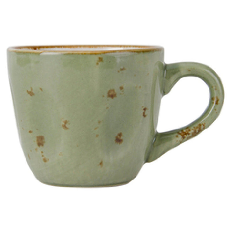 The Tuxton GGO-085 Espresso Cup 3-1/2 Oz. 2-5/8" Dia. X 2-1/4"H is a meticulously crafted porcelain cup designed to meet the diverse needs of the hospitality industry, cafes, and home espresso enthusiasts. With a volume of 3-1/2 ounces, this cup is ideal for serving espresso shots, ensuring portion accuracy and enhancing the presentation of finely brewed coffee. Its dimensions, 2-5/8 inches in diameter and 2-1/4 inches in height, provide a comfortable grip and a pleasing aesthetic that complements any tabletop setting. Equipped with a durable handle, it ensures a secure and comfortable hold for users. The Tuxton GGO-085 is made from fully vitrified porcelain, guaranteeing a lead-free, safe material that withstands the rigors of daily use. Its microwave and dishwasher-safe properties offer convenience and efficiency in fast-paced environments, while its oven-proof nature adds versatility for creative coffee presentations. Part of the TuxTrendz® Artisan Geode collection in an Olive color, this espresso cup combines functional durability with a stylish design. Packed by 2 dozen per case, it is an excellent choice for businesses looking to maintain a consistent and elegant theme across their service ware. Whether in a bustling café or a refined dining establishment, this cup serves as a reliable and attractive option.