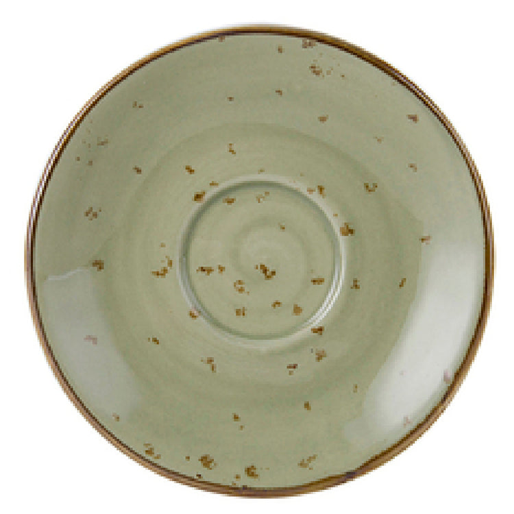 The Tuxton GGO-086 Espresso Saucer 5" Dia. Round is a meticulously crafted piece of porcelain tableware that showcases a blend of functionality and aesthetic appeal. With a diameter of 5 inches, this espresso saucer is designed to accommodate espresso cups with style and ease. It is made from fully vitrified porcelain, ensuring durability and an impermeable finish that prevents moisture absorption, making it suitable for rigorous use in both residential and commercial settings. The saucer is microwave and dishwasher safe, adding convenience to its usage, and is oven-proof, allowing for versatile culinary applications. Emphasizing safety and health standards, it is lead-free, which is crucial for the food and beverage industry. The TuxTrendz® Artisan Geode design in Olive provides an elegant and earthy tone, adding a sophisticated touch to any dining setting. This product is packed by 2 dozen per case, making it an efficient choice for bulk purchasing for businesses such as cafés, restaurants, or catering services that require both quality and quantity. The Tuxton GGO-086 Espresso Saucer is a versatile and reliable choice for any setting that values both style and practicality in their tableware selection.