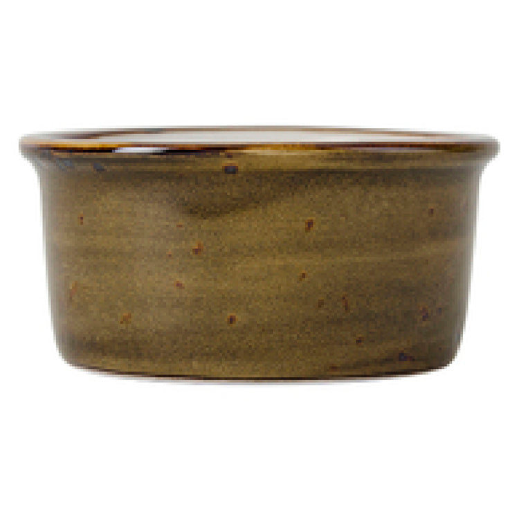 The Tuxton GGW-752 Ramekin 2-1/2 Oz. 3" Dia. x 1-1/2"H is a meticulously crafted piece of porcelain ware designed to meet the diversified needs of culinary professionals. With a capacity of 2-1/2 ounces, it is ideal for serving small portions of sauces, dips, or condiments, making it a versatile addition to any table setting. This round ramekin, measuring 3 inches in diameter and 1-1/2 inches in height, is tailored for both aesthetic appeal and practical use. Its fully vitrified construction ensures durability and resistance to water absorption, while being lead-free guarantees safety in food service. The ramekin's compatibility with microwave and dishwasher use underscores its convenience for everyday kitchen operations, and its oven-proof nature extends its functional utility for baking or reheating. Part of the TuxTrendz® Artisan Geode collection, its Walnut finish adds a touch of elegance, seamlessly blending with diverse dining setups. Packed by 2 dozen per case, it is a valuable option for establishments requiring bulk quantities without compromising on quality. The Tuxton GGW-752 Ramekin stands out as a reliable and stylish option for the food service industry, providing both form and function to enhance culinary presentation.