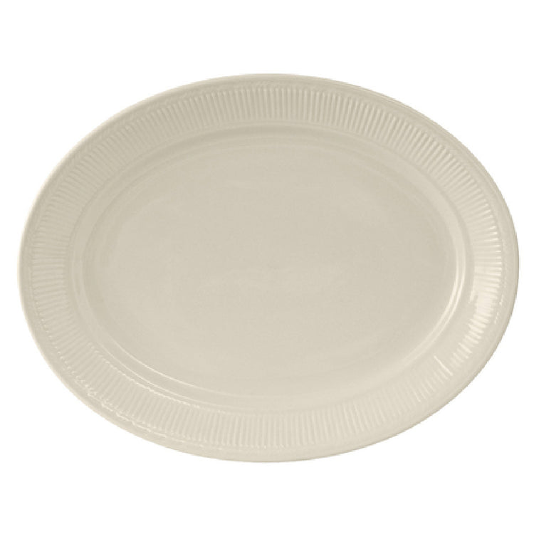 The Tuxton HEH-131 Platter 13" X 10-1/8" Oval is a meticulously crafted serving piece, ideal for a variety of dining environments. This platter boasts a wide rim and an embossed design, enhancing its aesthetic appeal while remaining functional for everyday use. Measuring 13 inches by 10-1/8 inches, its oval shape provides ample surface area for presenting main courses, appetizers, or desserts. The platter is designed with durability in mind, being fully vitrified and lead-free, ensuring it withstands the demands of both microwave and dishwasher use. Additionally, it is oven-proof, making it versatile for warming and serving purposes. Constructed from high-quality ceramic, it features the Hampshire design in an American White/Eggshell finish, offering a classic and elegant presentation that complements a wide range of table settings. Sold in a convenient packaging of one dozen, it is an excellent choice for restaurants, hotels, or catering services looking to enhance their service with reliable and stylish tableware. The Tuxton HEH-131 Platter combines functionality with timeless design, making it a valuable addition to any professional dining establishment.