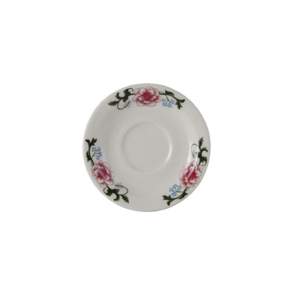 The Tuxton LCE-054 Saucer 5-1/2" Round is a meticulously crafted piece of dinnerware that provides both functionality and aesthetic appeal. With a diameter of 5-1/2 inches, this round saucer features a narrow rim design, making it a refined addition to any table setting. The Western Rose pattern, combined with an eggshell finish, adds a touch of elegance and sophistication to its appearance, making it suitable for upscale dining environments. This saucer is packed by 3 dozen per case, indicating its suitability for high-volume establishments such as restaurants and catering services that require durable and stylish dinnerware solutions. Tuxton China is known for its commitment to quality and durability, and the LCE-054 saucer exemplifies this with its robust construction designed to withstand the rigors of commercial use. The precise dimensions and attractive design of this saucer make it an excellent choice for a variety of settings, from casual cafes to formal banquet halls. The Tuxton LCE-054 Saucer is a versatile and reliable option that supports diverse dining experiences while maintaining a high standard of quality and visual appeal.