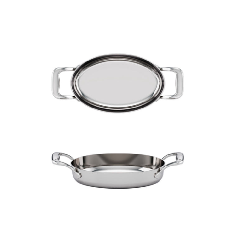 Tuxton China, RTVH-080, TuxCLAD 8-Inch Oval Pan, 22-Fluid Ounce, 5.0"W x 8.0"L x 1.5"H, Triply, Solid Stainless Steel Handle, Riveted (Refer to Tuxton.com for Full Warranty Policy) *Special Order Item (Packed By: 1 Each)