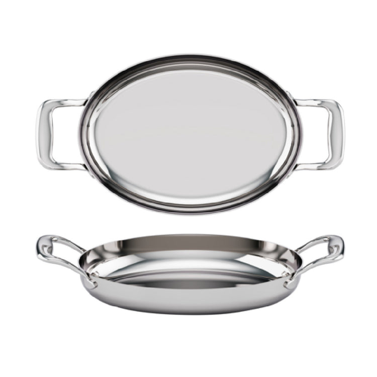 Tuxton China, RTVH-120, TuxCLAD 12-Inch Oval Pan, 60-Fluid Ounce, 8.0"W x 11.75"L x 1.75"H, Triply, Solid Stainless Steel Handle, Riveted (Refer to Tuxton.com for Full Warranty Policy) *Special Order Item (Packed By: 1 Each)