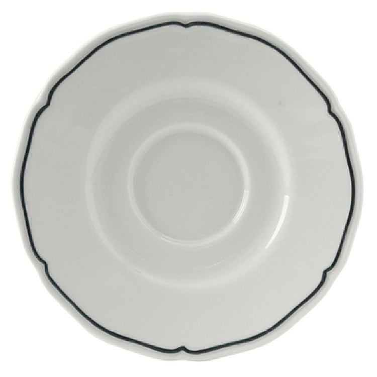 The Tuxton SBE-060 Saucer 6" Dia. Round is a meticulously crafted piece of tableware that embodies a blend of practicality and elegance, tailored for a multitude of industry segments including hospitality and catering. This 6-inch diameter saucer features a distinctive scalloped edge, enhancing its aesthetic appeal while maintaining functionality. Engineered to withstand the rigors of both microwave and dishwasher use, this saucer is also oven-proof, highlighting its versatility in various service environments. The saucer is fully vitrified, ensuring durability and a sleek finish, while being lead-free to meet safety standards. It is constructed from porcelain, offering a classic look with its Porcelain White finish accented by a subtle Blue Band, part of the TuxTrendz®© Charleston collection. This design choice not only adds a touch of sophistication but also aligns with contemporary dining trends. The Tuxton SBE-060 Saucer is sold in bulk, packed by 3 dozen per case, making it a cost-effective solution for businesses requiring high-volume purchases without compromising on quality. Its robust construction and elegant design make it a valuable addition to any professional setting, where durability, safety, and style are paramount.