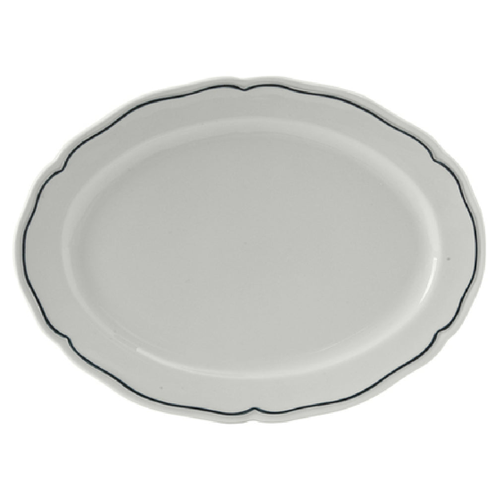 The Tuxton SBH-104 Platter 10-1/2" X 7-3/4" Oval is a versatile dining accessory crafted for both commercial establishments and home use. This platter distinguishes itself with its scalloped edge, adding a touch of elegance to any table setting. Made from fully vitrified porcelain, it guarantees durability and a non-porous surface, making it lead-free and safe for all food types. Its dimensions - 10-1/2 inches long and 7-3/4 inches wide - offer ample space for diverse culinary presentations, from appetizers to entrees. The platter is microwave and dishwasher safe, ensuring convenience in both preparation and cleanup. Additionally, it is oven proof, allowing for seamless transitions from cooking to serving. The Tuxton SBH-104 Platter is part of the TuxTrendz® Charleston collection, renowned for its classic Porcelain White finish accented with a Blue Band, enhancing its aesthetic appeal. Whether used in bustling restaurants or for elegant home entertaining, this platter offers both functionality and style. Packed by the dozen, it is an excellent choice for establishments looking to maintain a cohesive and sophisticated dining experience.