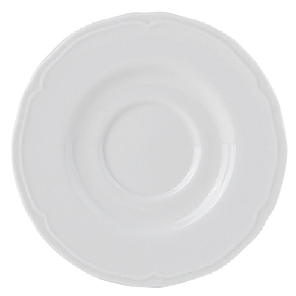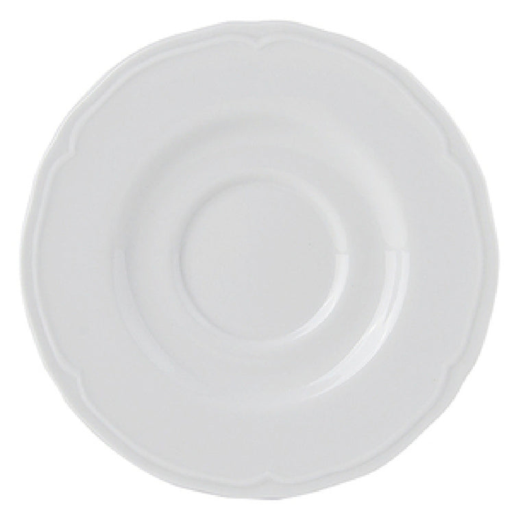 The Tuxton SCE-050 Espresso Saucer 5" Dia. Round is a meticulously crafted porcelain saucer designed to enhance the presentation of espresso servings. This saucer features a 5-inch diameter and a distinctive scalloped edge that adds a touch of elegance to its appearance. Engineered for durability and practicality, it is both microwave and dishwasher safe, ensuring ease of use in fast-paced service environments. The saucer is oven proof and fully vitrified, which means it is exceptionally sturdy and resistant to water absorption, thereby enhancing its durability. Made from lead-free porcelain, it upholds safety and quality standards in food service. The Tuxton SCE-050 is part of the TuxTrendz® Charleston collection and comes in a classic Porcelain White color, making it a versatile choice for various dining settings. Each case is conveniently packed with 3 dozen saucers, catering to the needs of both small cafes and large-scale food service operations. The combination of its aesthetic appeal and functional properties makes the Tuxton SCE-050 Espresso Saucer a valuable addition to any coffee presentation, suitable for both professional baristas and home enthusiasts who demand excellence in their espresso serving ware.