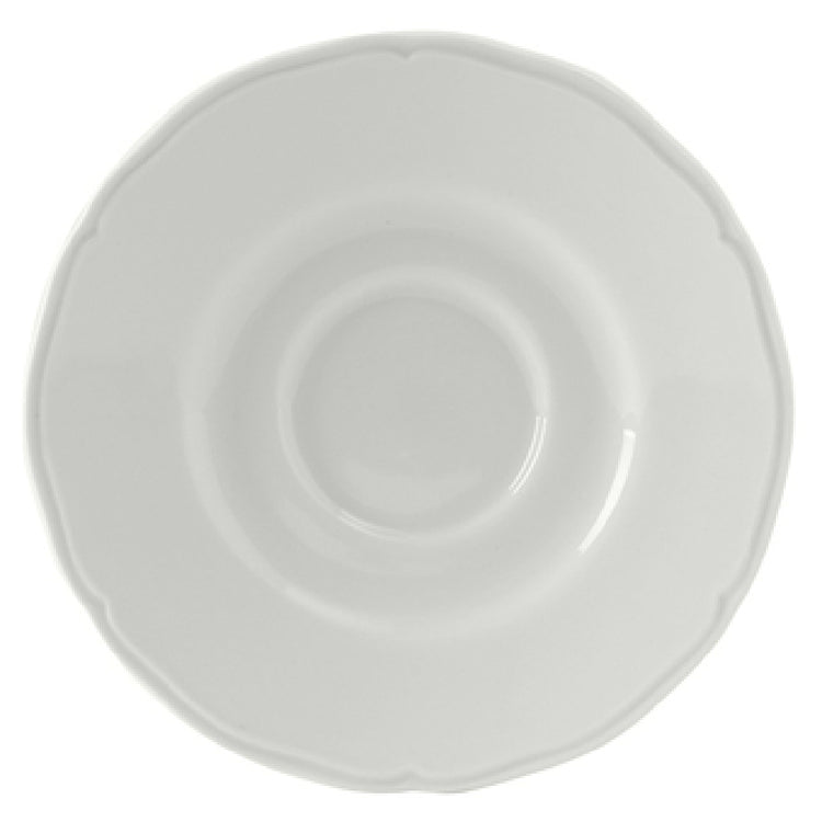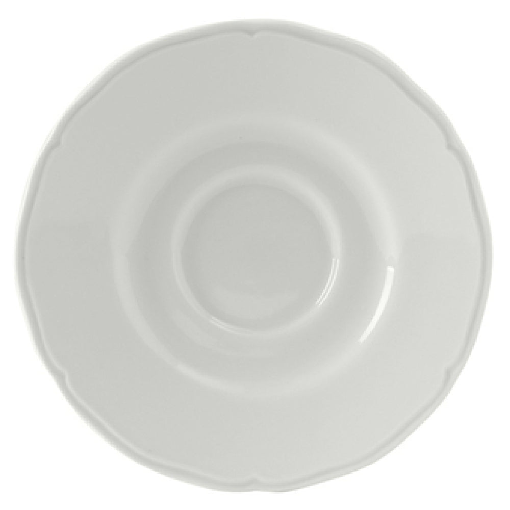 The Tuxton SCE-060 Saucer 6" Dia. Round is a versatile piece of tableware designed to meet the demands of both commercial and residential dining settings. This saucer features a round shape with an elegant scalloped edge, adding a touch of sophistication to any table arrangement. With a 6-inch diameter, it is perfectly sized for serving beverages or small appetizers. Crafted from fully vitrified porcelain, this saucer is lead-free, ensuring safety and durability in a variety of environments. The Tuxton SCE-060 is microwave and dishwasher safe, offering convenience for fast-paced restaurant kitchens or home use. Additionally, it is oven proof, allowing it to withstand high temperatures without compromising its structural integrity. This product is part of the TuxTrendz® Charleston collection and comes in a classic Porcelain White, making it a timeless addition to any tabletop. Packed by 3 dozen per case, it is an economical choice for hospitality businesses needing bulk quantities. The Tuxton SCE-060 Saucer is suitable for a range of industry segments, from fine dining establishments to casual eateries, offering a combination of aesthetic appeal, functionality, and high-quality construction.