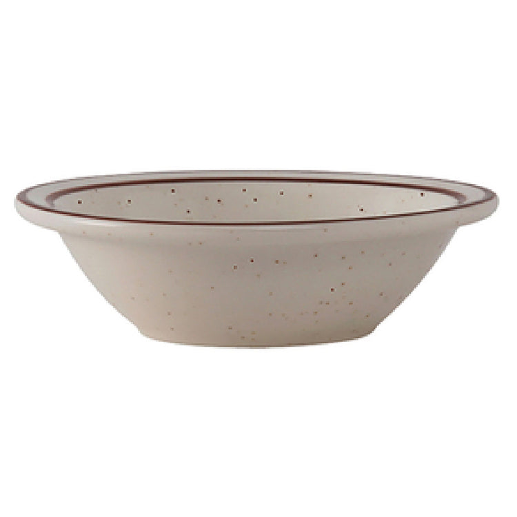 The Tuxton TBS-011 Fruit Dish is a versatile piece of dinnerware, meticulously crafted to meet the diverse needs of the food service industry. With a capacity of 3-1/2 oz. and a diameter of 4-5/8", this round dish features a narrow rim that accentuates its sleek design. It is microwave and dishwasher safe, making it a practical choice for both commercial and residential kitchens that value convenience and efficiency. Additionally, the dish is oven-proof, which enhances its adaptability for various culinary applications. Made from fully vitrified ceramic, the Tuxton TBS-011 ensures durability and long-term performance. Being lead-free, it aligns with safety and health standards, making it an ideal option for healthcare and hospitality settings that prioritize safety. The dish's American White/Eggshell finish, accented with a brown speckle, not only adds to its aesthetic appeal but also complements various table settings. Marketed under the TuxCare® brand, this fruit dish promises quality and reliability. It is packed in cases of 3 dozen, reflecting its suitability for large-scale catering services. Its origin from the Bahamas adds a touch of exclusivity, enhancing its appeal across different market segments within the industry.