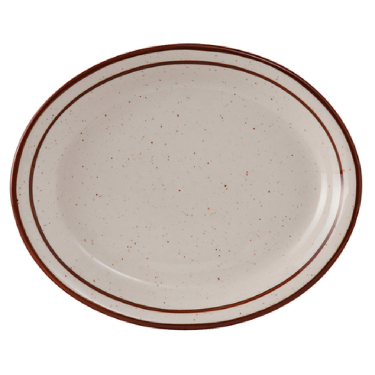 The Tuxton TBS-014 Platter 13-1/4" X 10-1/2" Oval is a versatile dining accessory, meticulously designed to suit various dining environments. This platter, with its dimensions of 13-1/4 inches by 10-1/2 inches, is ideal for serving a variety of dishes, offering ample space for culinary presentations. Its oval shape and narrow rim add a sophisticated touch, enhancing both form and function. Constructed from ceramic, this platter is fully vitrified, ensuring durability and resistance to chipping. The platter is lead-free, prioritizing user safety and environmental responsibility. It is designed for convenience, being microwave and dishwasher safe, which facilitates seamless integration into fast-paced kitchen environments. Additionally, its oven-proof nature expands its utility, accommodating different cooking and serving needs. The platter's aesthetic appeal is heightened with its Bahamas, American White/Eggshell color accented by brown speckles, making it a visually pleasing choice for any table setting. Packed by the dozen, it is an excellent option for restaurants, catering services, and hospitality businesses seeking elegant yet practical serveware. The Tuxton TBS-014 Platter combines functional design with an attractive appearance, making it a valuable addition to any professional dining collection.