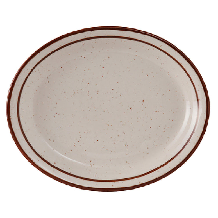 The Tuxton TBS-914 Platter 13-3/4" x 11-1/4" Oval is a versatile and durable piece of serveware renowned for its usability in various dining settings. Crafted from fully vitrified ceramic, this platter offers superior strength and a lead-free composition, ensuring safety and durability. Its oval shape coupled with a narrow rim provides an elegant yet practical design, ideal for both casual and formal dining environments. The platter is finished in an American White/Eggshell color with a subtle brown speckle pattern, adding a touch of sophistication and style. Measuring 13-3/4 inches in length and 11-1/4 inches in width, it is perfectly sized for serving a variety of dishes, from main courses to shared appetizers. The Tuxton TBS-914 is microwave and dishwasher safe, offering convenience for fast-paced dining establishments and home use alike. Additionally, its oven-proof quality makes it suitable for warming dishes, enhancing its functionality. Sold in packs of one dozen, the platter is an economical choice for restaurants, catering services, and hospitality industries seeking reliable and aesthetically pleasing serveware. The Tuxton TBS-914 Platter blends practicality with elegance, making it a valuable addition to any table setting.