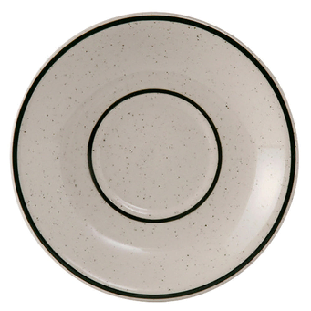 The Tuxton TES-002 Saucer 6" Dia. Round is a versatile piece designed to meet the demands of various market segments from commercial dining establishments to healthcare facilities. Measuring 6 inches in diameter, this round saucer features a coupe shape with a narrow rim, offering a sleek and modern aesthetic. It is microwave and dishwasher safe, allowing for easy cleaning and efficient use in fast-paced environments. The saucer is oven proof and fully vitrified, ensuring durability and resistance to thermal shock, making it suitable for a wide range of temperatures. Constructed from lead-free ceramic material, it aligns with safety and health standards, especially important in healthcare settings. The TuxCare® proprietary technology further enhances its appeal by providing a surface that aids in maintaining hygiene. Its American White/Eggshell color with a Green Speckle pattern adds a touch of elegance, suitable for enhancing table settings in diverse dining contexts. Packed by 3 dozen per case, it is an ideal choice for bulk purchasing by restaurants or institutions that require consistency and reliability in their dinnerware. This combination of features makes the Tuxton TES-002 Saucer a practical and stylish addition to any professional or institutional dining collection.