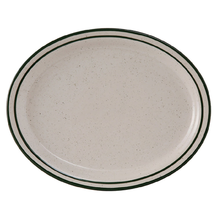 The Tuxton TES-013 Platter 11-1/2" X 9-1/8" Oval is a meticulously designed piece of ceramic dinnerware that combines functional elegance with durability, making it a versatile choice for a range of dining environments. This oval platter features dimensions of 11-1/2 inches in length and 9-1/8 inches in width, providing ample space for presenting a variety of culinary creations. The narrow rim design enhances its aesthetic appeal while maximizing the serving area. Constructed from fully vitrified ceramic, this platter is lead-free, ensuring safety for both commercial and home use. The Tuxton TES-013 is microwave and dishwasher safe, offering convenience for busy kitchens, and is oven proof, allowing for versatile cooking and serving options. Its American White/Eggshell color with Green Speckle adds a touch of sophistication, making it suitable for both casual and formal dining settings. Packed by the dozen, this platter is ideal for restaurants, catering services, and hospitality venues that require durable and stylish tableware in bulk. The Tuxton TES-013 Platter's combination of practical features and elegant design makes it a valuable asset for professionals seeking reliable and attractive serving solutions.
